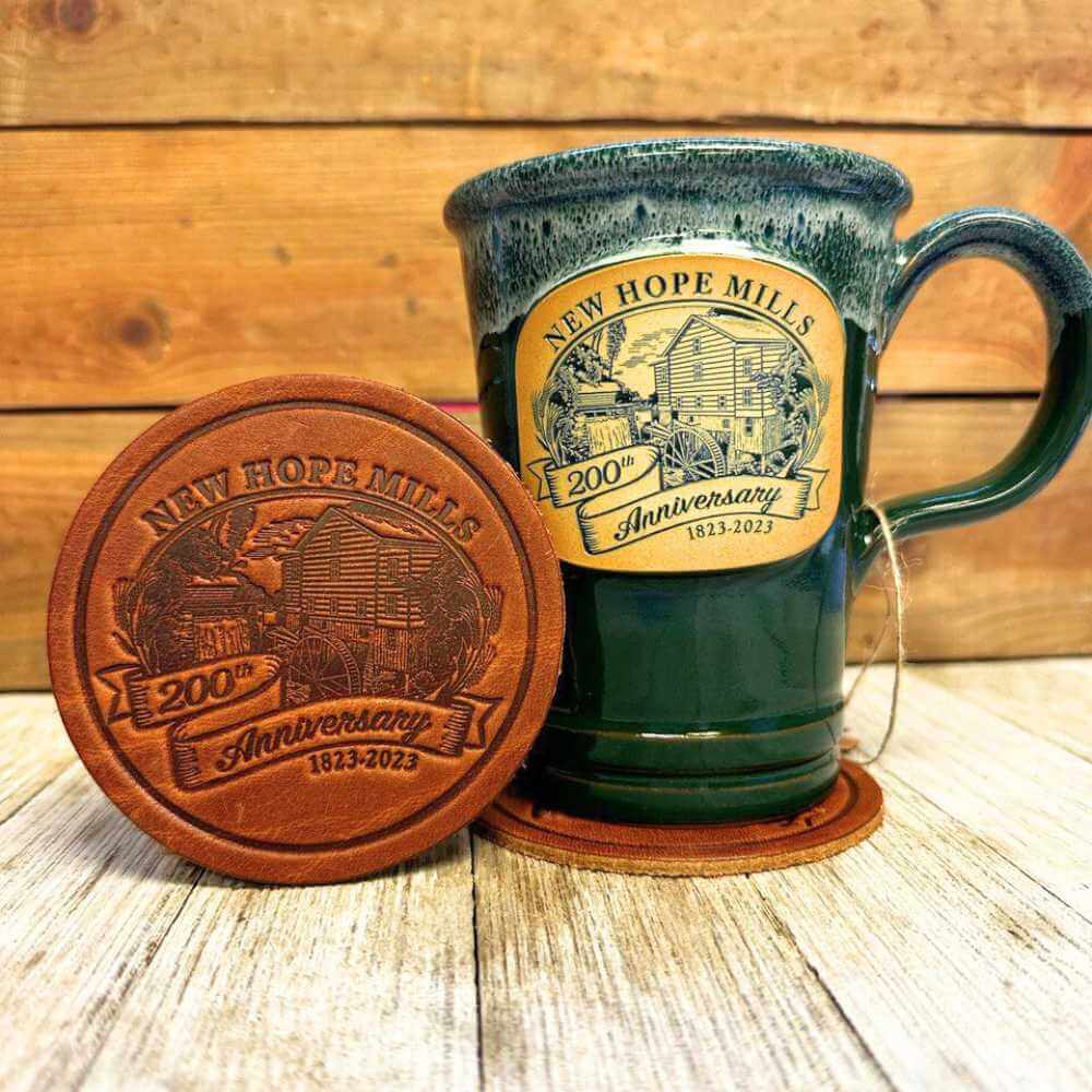 This coaster, bearing the commemorative New Hope Mills 200th Anniversary logo-embossed on two sides-is a classic item that recognizes and appreciates excellence in exemplary form over both centuries.